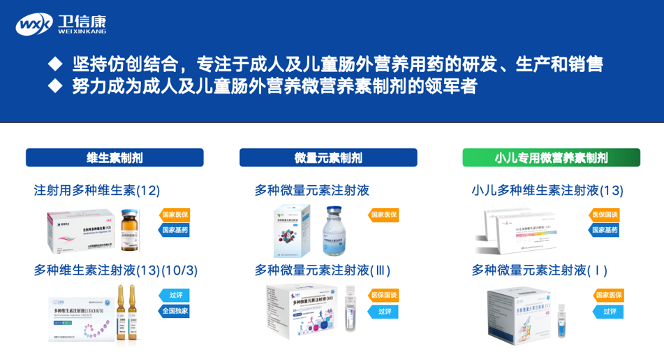 多年來(lái),衛(wèi)信康深耕腸外營(yíng)養(yǎng)微營(yíng)養(yǎng)素制劑的研、產(chǎn)、銷一體化運(yùn)營(yíng),產(chǎn)品管線覆蓋了成人和兒童領(lǐng)域的多種維生素、微量元素等制劑品種,目前已成為該細(xì)分領(lǐng)域的國(guó)內(nèi)優(yōu)勢(shì)企業(yè)。已研發(fā)上市的核心產(chǎn)品涵蓋:注射用多種維生素(12)、多種維生素(13)(10/3)水針/粉針、多種微量元素注射液、小兒多種維生素注射液(13)、復(fù)方電解質(zhì)注射液(V)等。