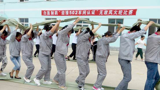 7月1日下午,用編織袋縫制而成的“風(fēng)火輪”正式亮相白醫(yī)制藥,所有員工聚集在活動(dòng)區(qū)域,準(zhǔn)備參加“迎接502認(rèn)證”拓展活動(dòng)無(wú)敵風(fēng)火輪比賽。